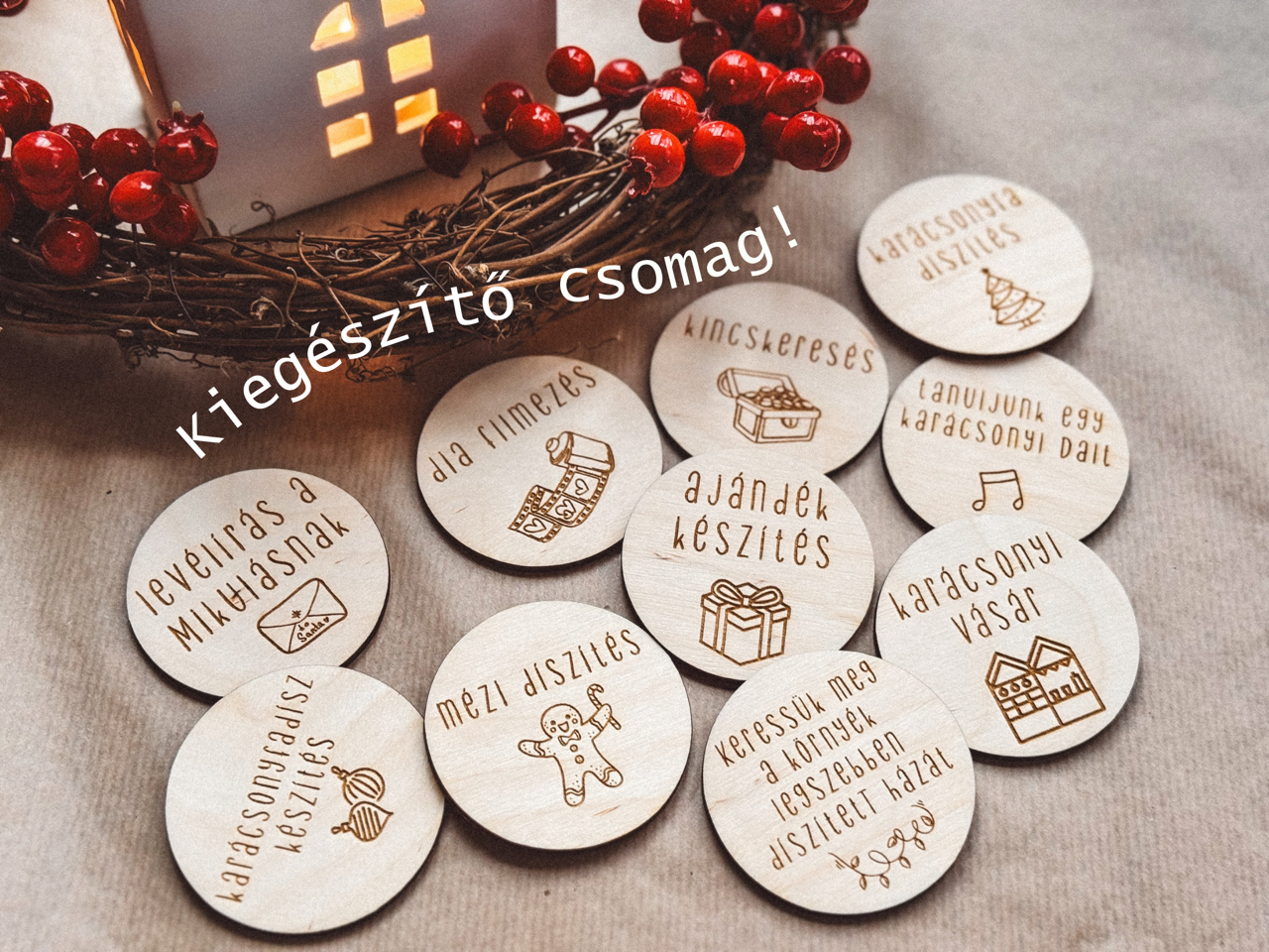 Töltsd meg az adventi naptárat közös élményekkel! A korongok többségén szuper családi programok szerepelnek, de találhatsz köztük adományozásra, jótékonyságra ösztönző kuponokat is. A 24 darab korongot szabadon használhatod, minden napra elrejthetsz egy kis élmény kupont, de válogathatsz is belőlük. A kuponokat nem muszáj aznap felhasználni, érdemes előre kijelölnöd egy “érvényességi időt”, amivel a gyerkőc szabadon gazdálkodhat.