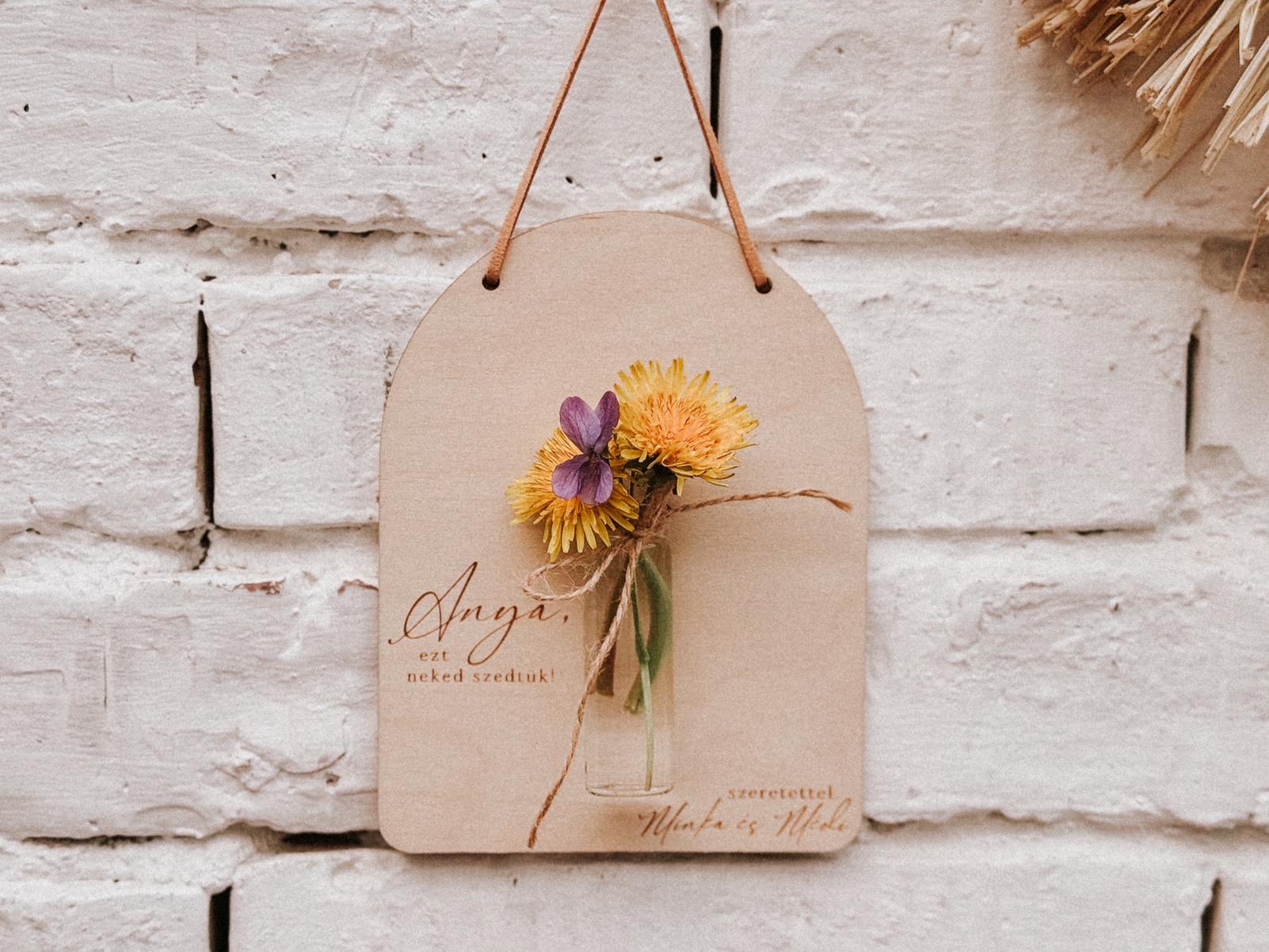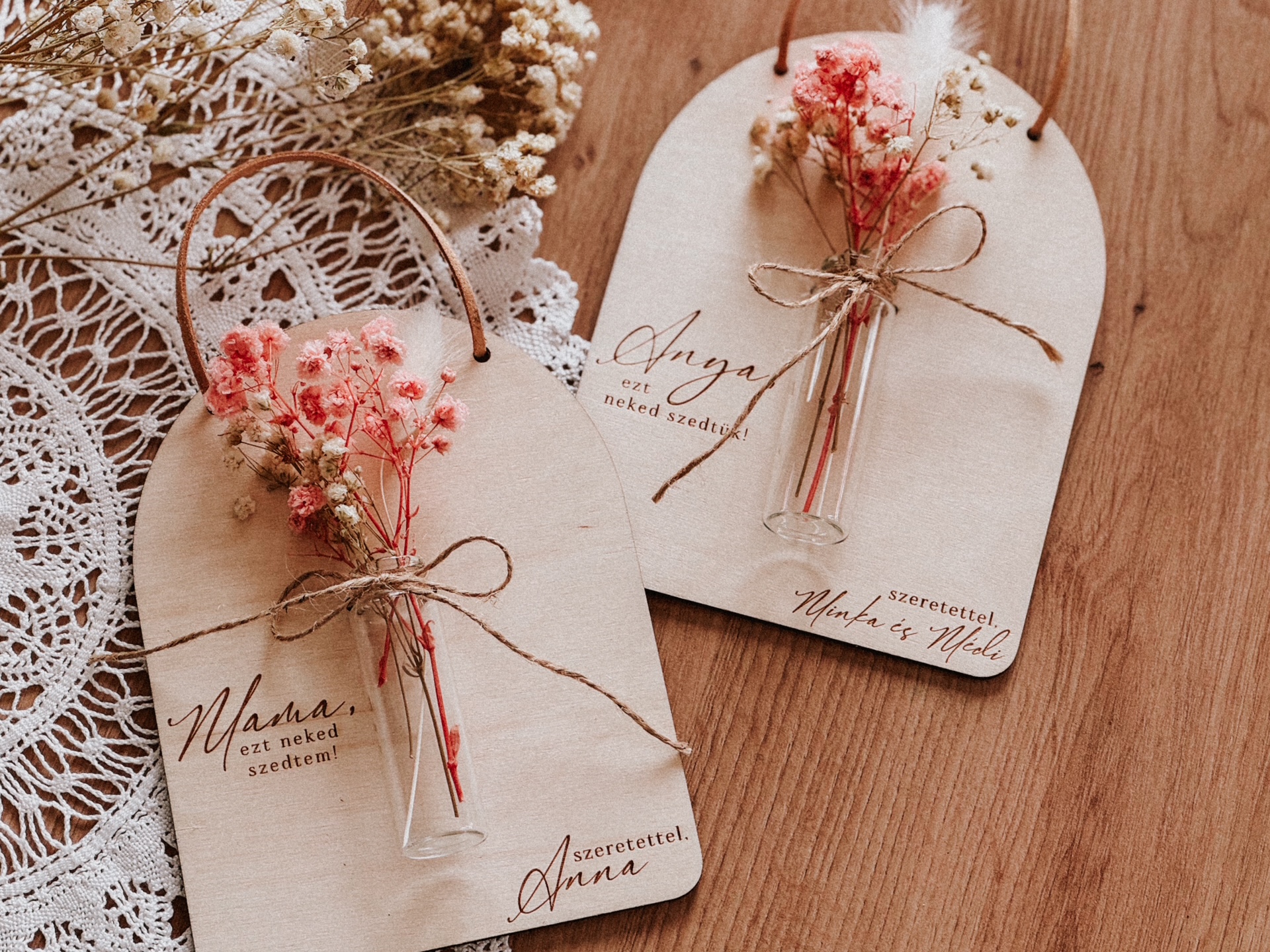 Egy apró, mégis különleges ajándék Anyák napjára, vagy más alkalomra. Ez a gravírozott fa falidísz kis üvegcsével és szárított mini virágcsokorral együtt érkezik, így az ajándék azonnal átadható.